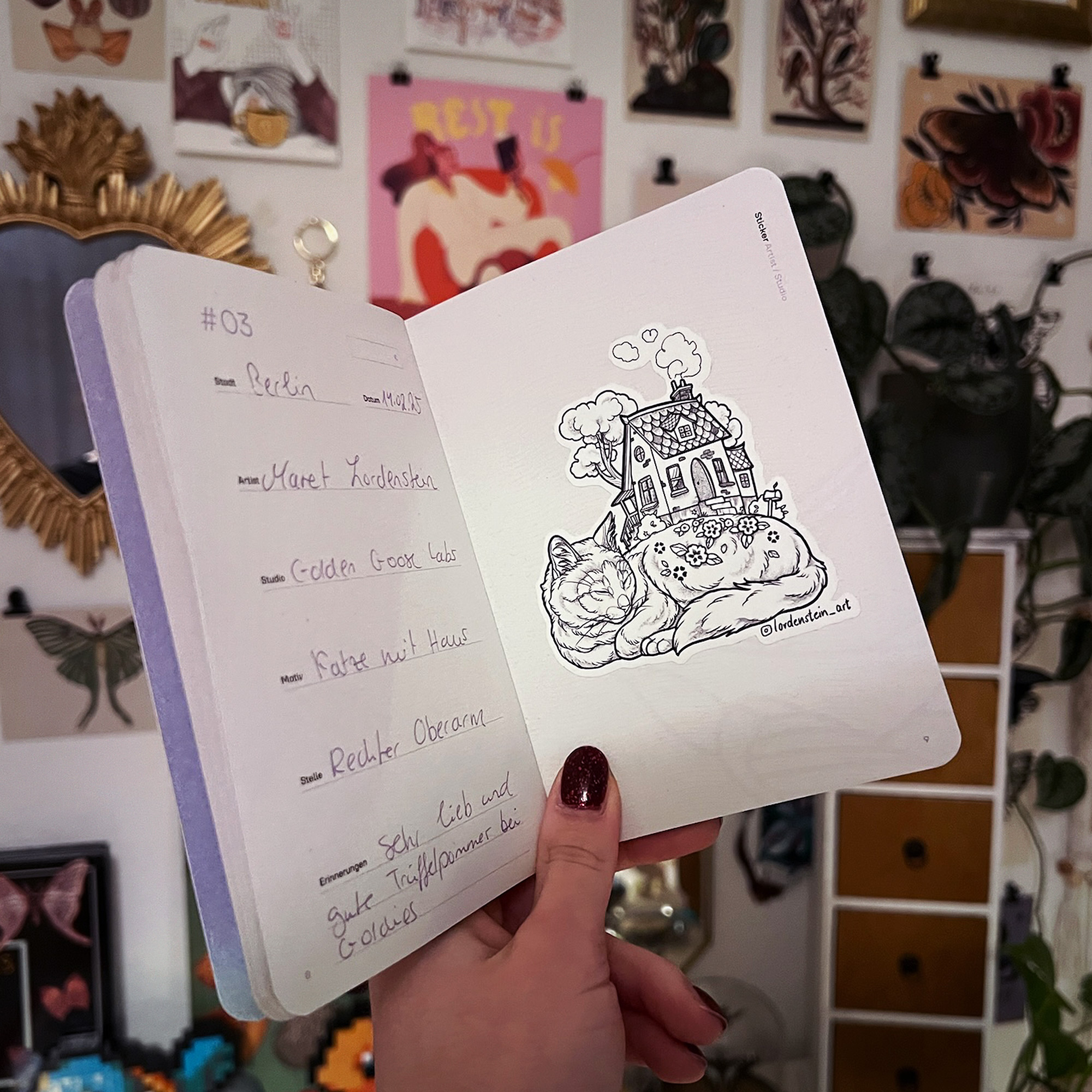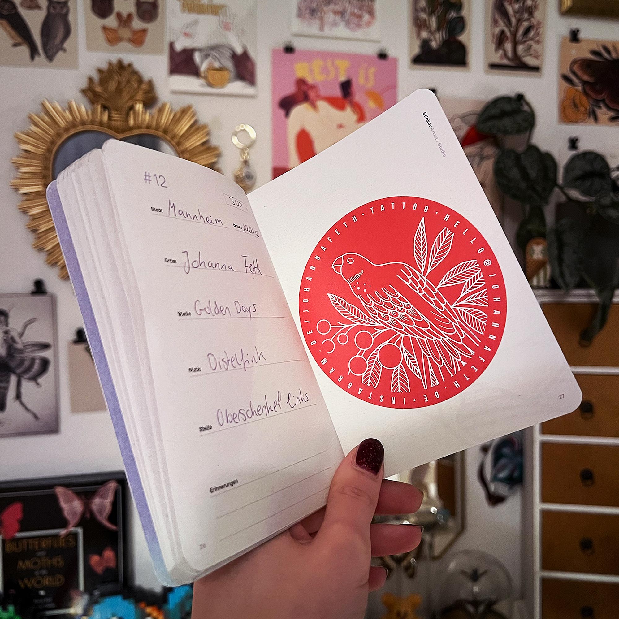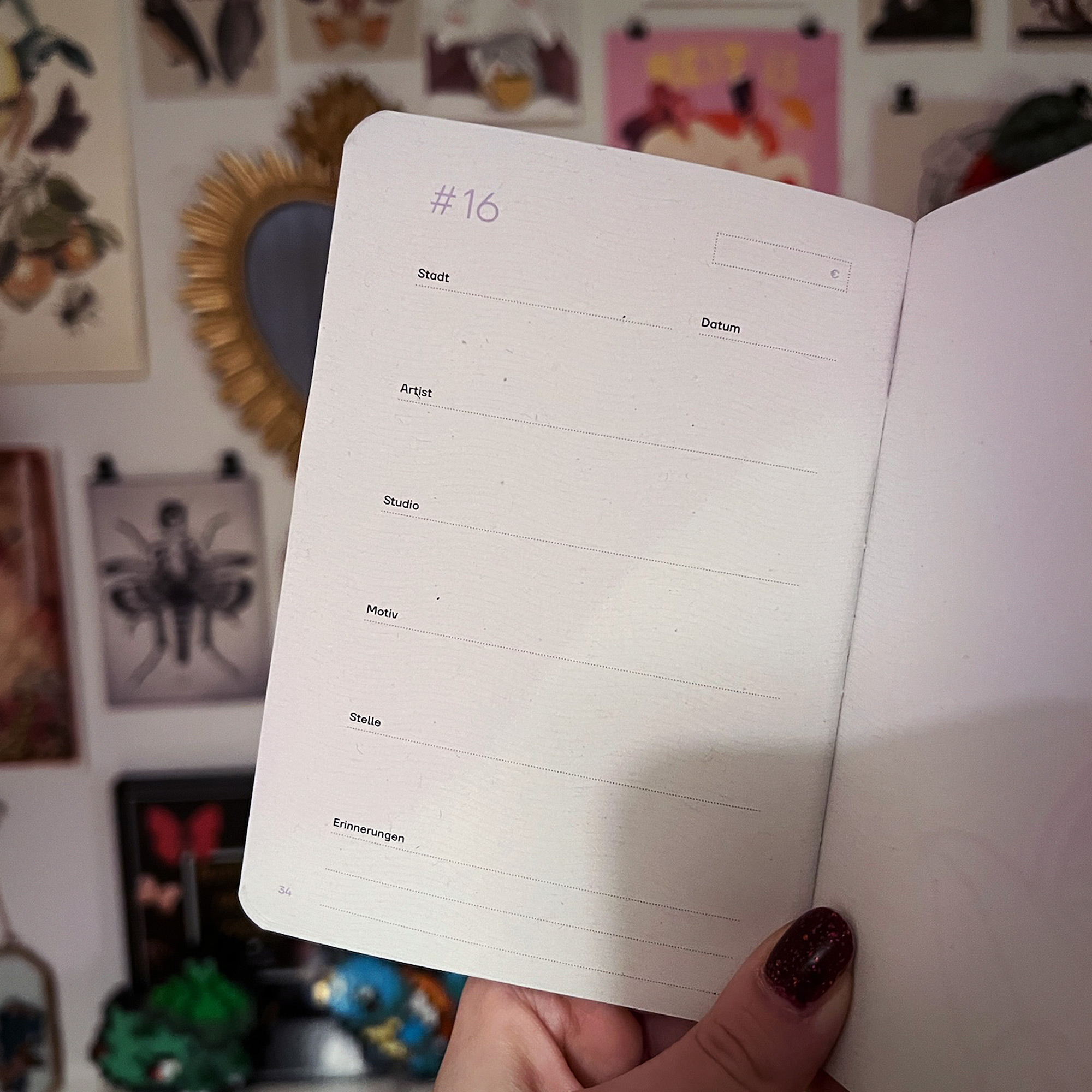 Er bietet Raum, um Tattoo-Termine zu dokumentieren, damit man sich auch in ein paar Jahren noch an alles erinnert: Studio, Artist, Datum, Preis, Motive und Gedanken. Zusätzlich gibt es Platz für Sticker, Notizen und erste Skizzen für deine nächsten Tattoo-Ideen.