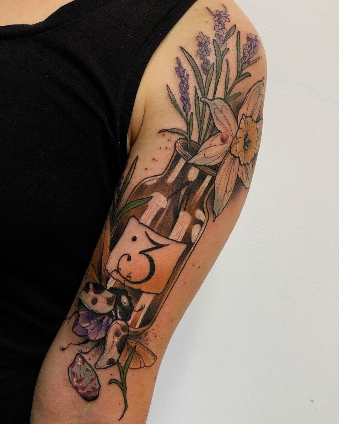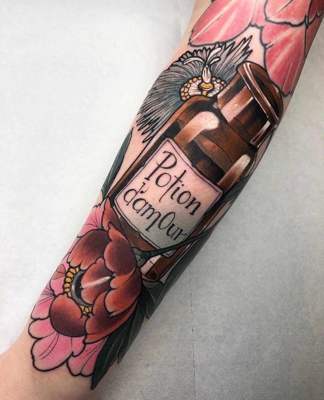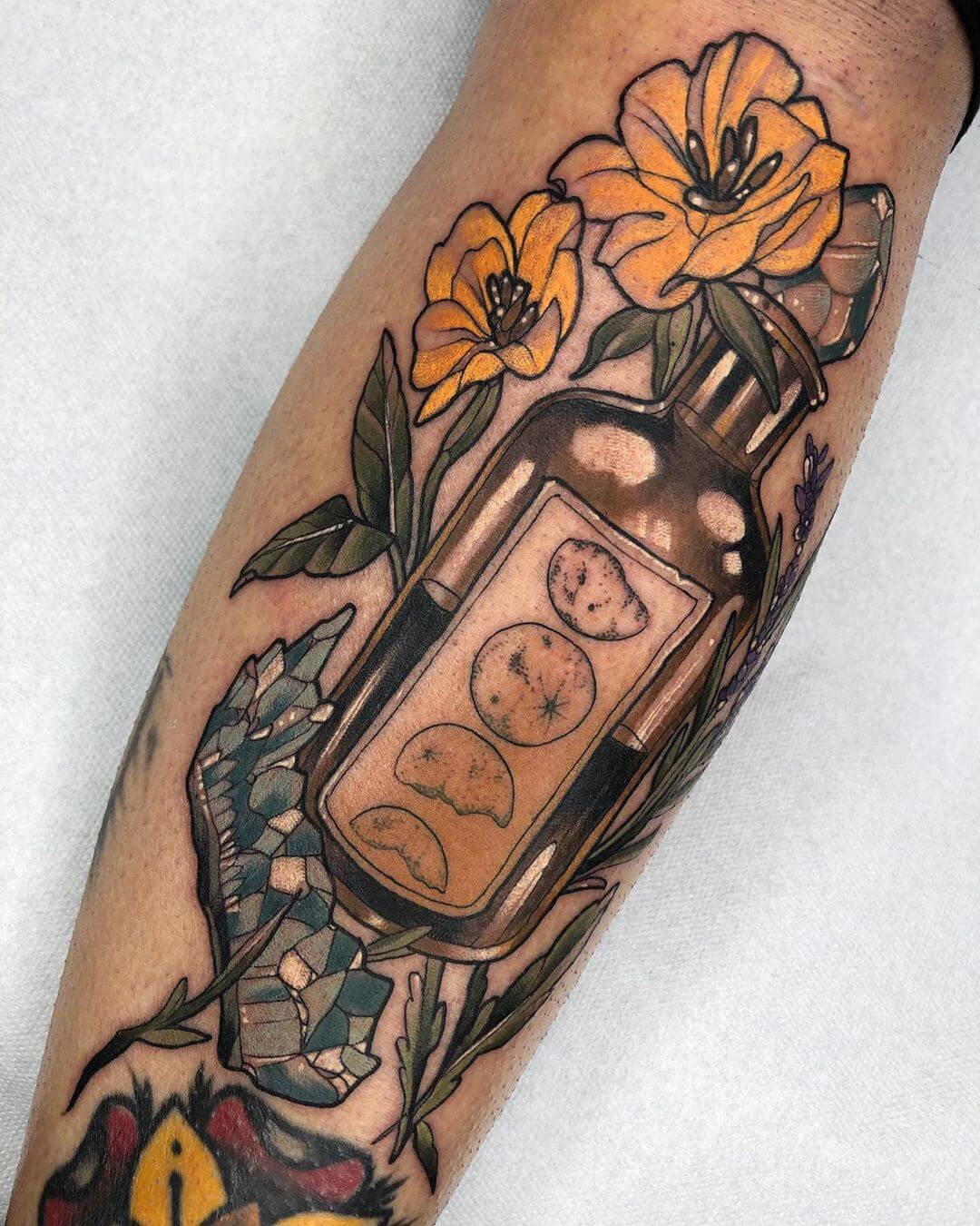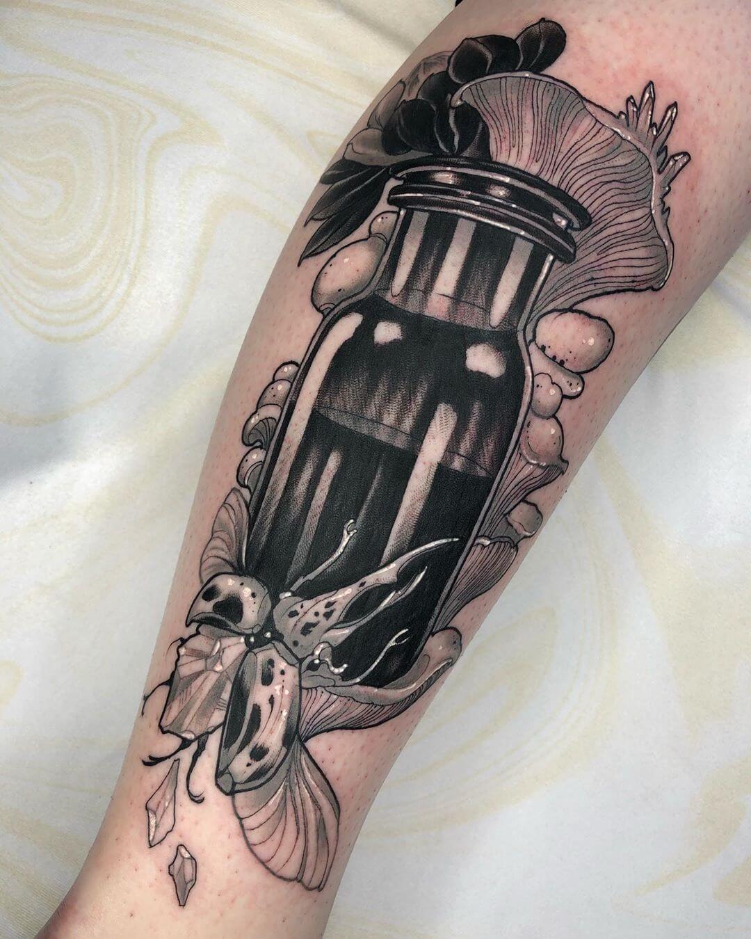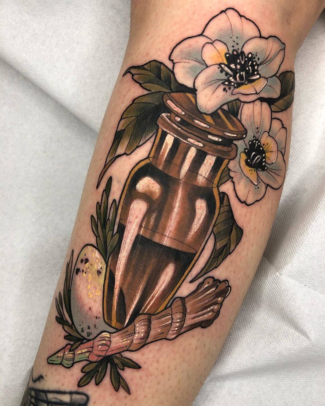 Neben Naturmotiven und Damenporträts mit surrealistischer Note sticht Lorena auch eine Menge magischer und okkulter Motive. Dazu gehören unter anderem Zaubertränke, bei denen sie die verschiedensten Zutaten kombiniert. Diese sehen nicht nur wundervoll aus, sondern haben meist auch noch eine Bedeutung oder besondere Kraft für ihre*n Träger*in. Wer sich eine Tätowierung mit Magie und Essenz wünscht, für den sind Lorenas magische Zaubertränke und Elixiere wohl genau das Richtige!