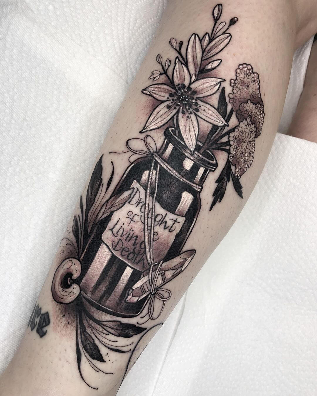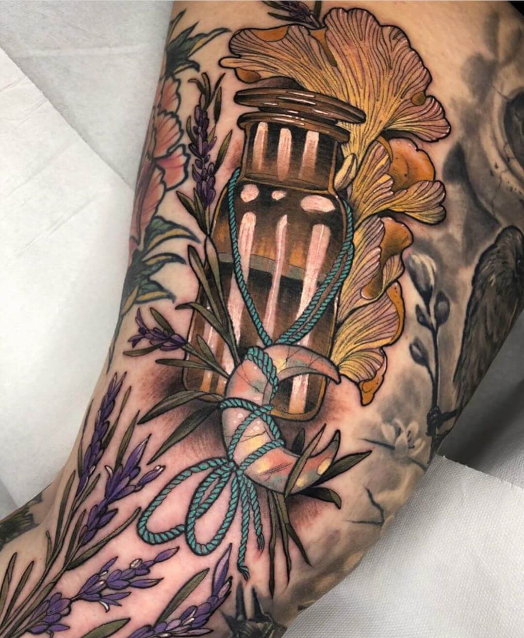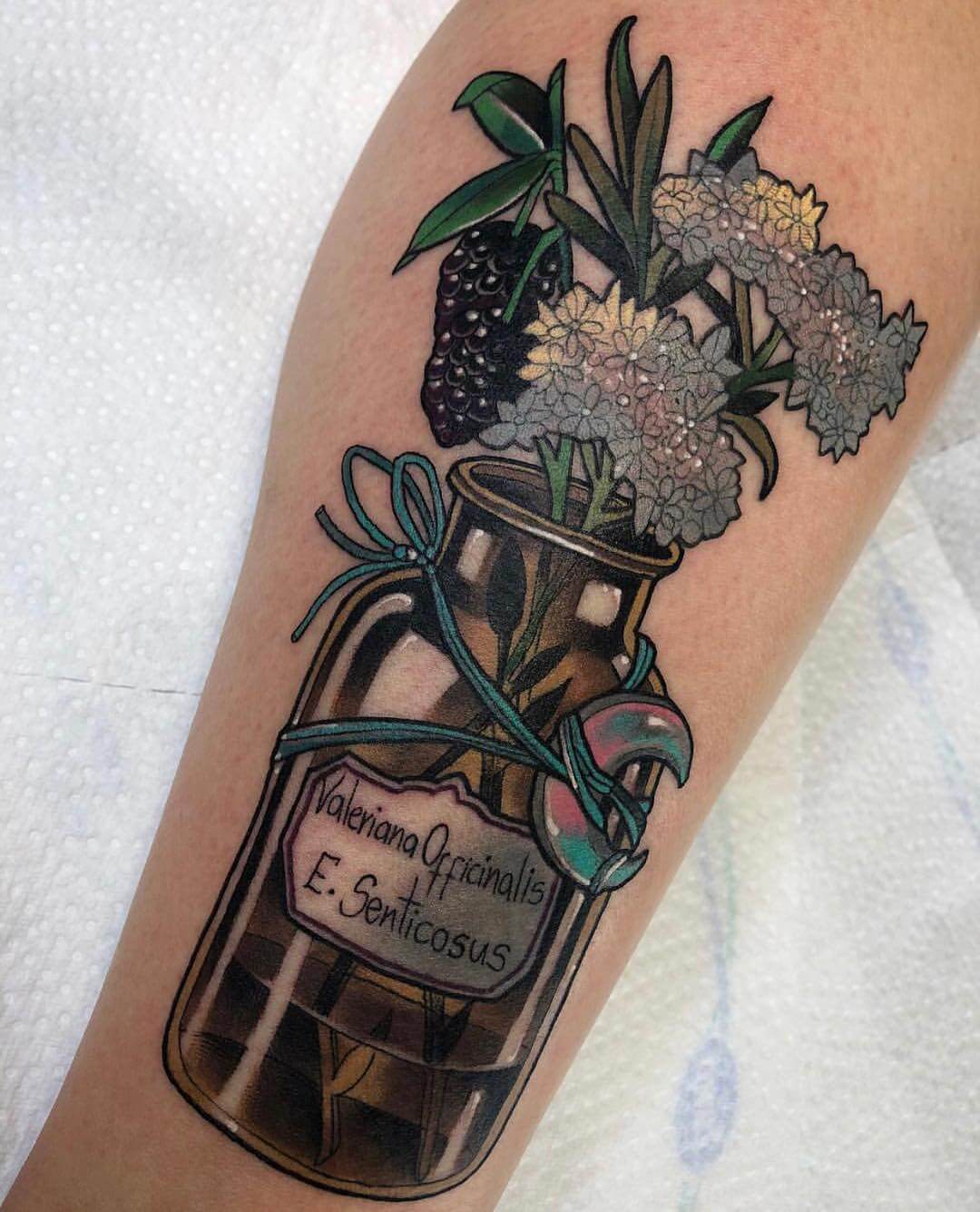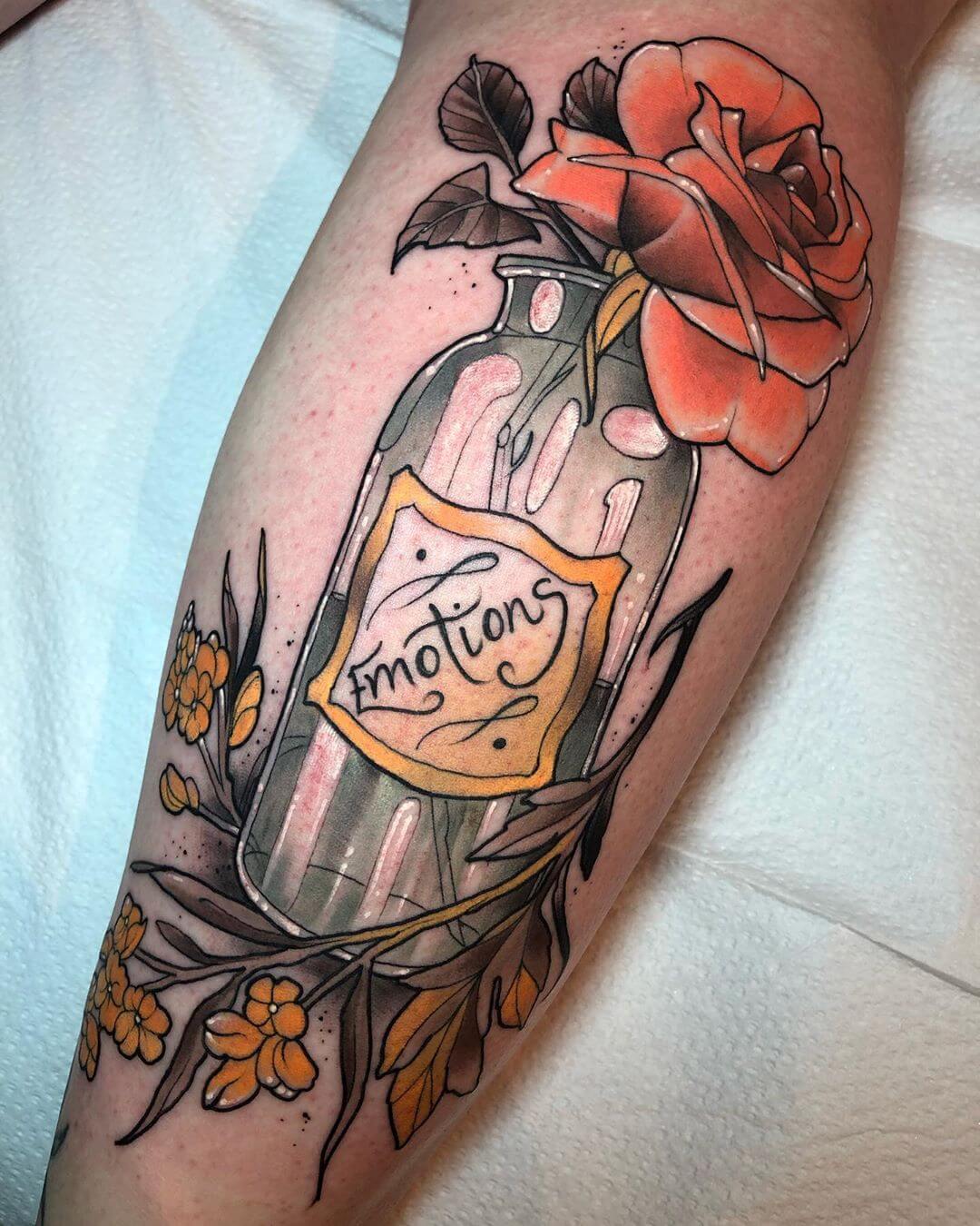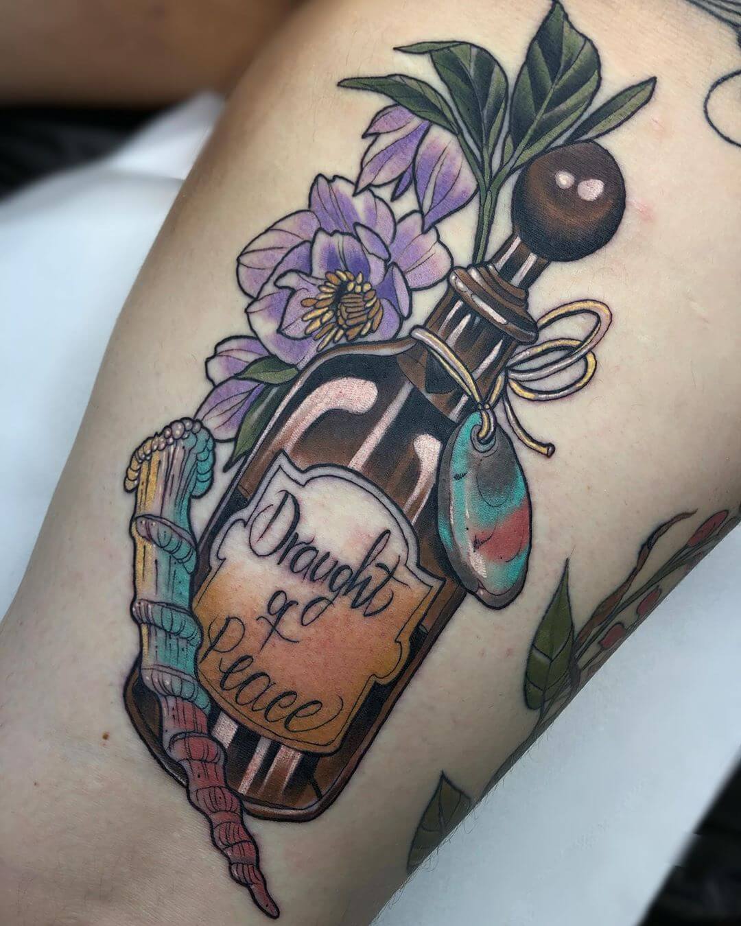 Neben Naturmotiven und Damenporträts mit surrealistischer Note sticht Lorena auch eine Menge magischer und okkulter Motive. Dazu gehören unter anderem Zaubertränke, bei denen sie die verschiedensten Zutaten kombiniert. Diese sehen nicht nur wundervoll aus, sondern haben meist auch noch eine Bedeutung oder besondere Kraft für ihre*n Träger*in. Wer sich eine Tätowierung mit Magie und Essenz wünscht, für den sind Lorenas magische Zaubertränke und Elixiere wohl genau das Richtige!