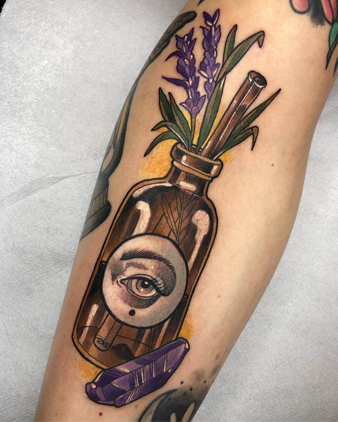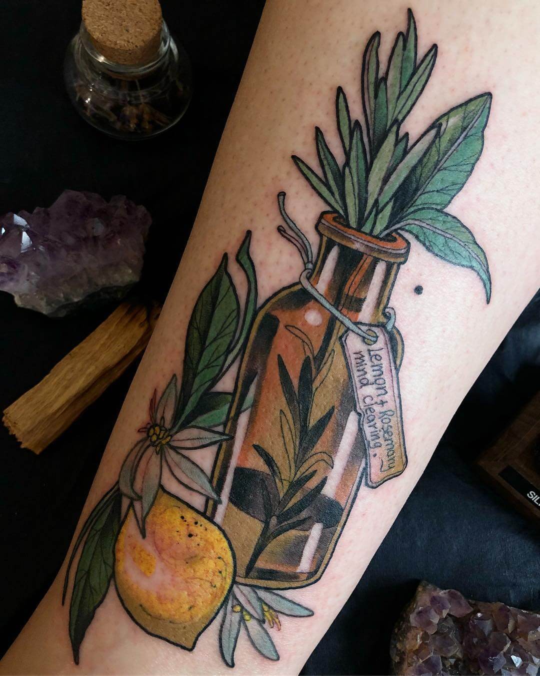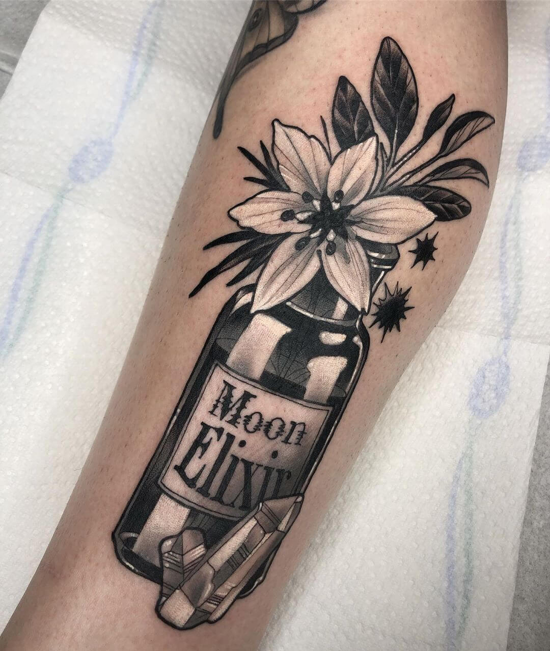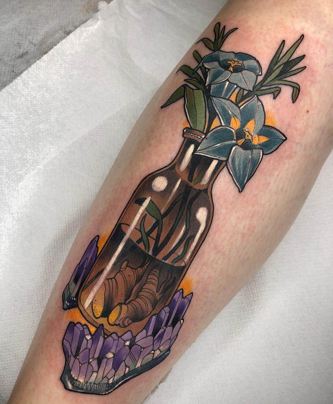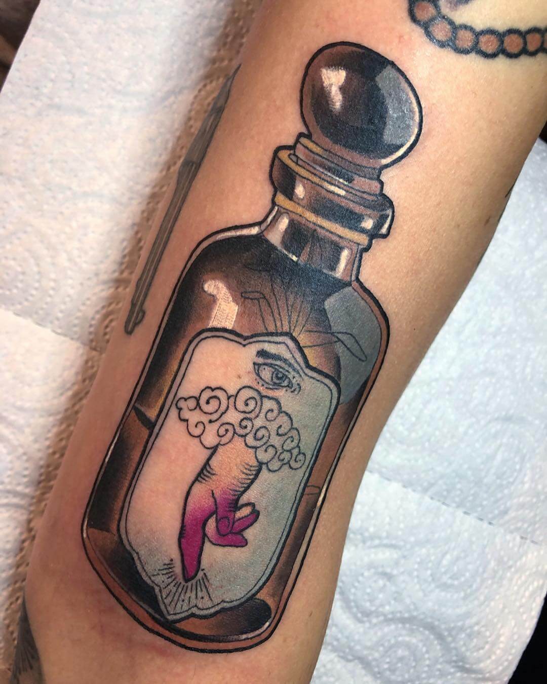 Neben Naturmotiven und Damenporträts mit surrealistischer Note sticht Lorena auch eine Menge magischer und okkulter Motive. Dazu gehören unter anderem Zaubertränke, bei denen sie die verschiedensten Zutaten kombiniert. Diese sehen nicht nur wundervoll aus, sondern haben meist auch noch eine Bedeutung oder besondere Kraft für ihre*n Träger*in. Wer sich eine Tätowierung mit Magie und Essenz wünscht, für den sind Lorenas magische Zaubertränke und Elixiere wohl genau das Richtige!