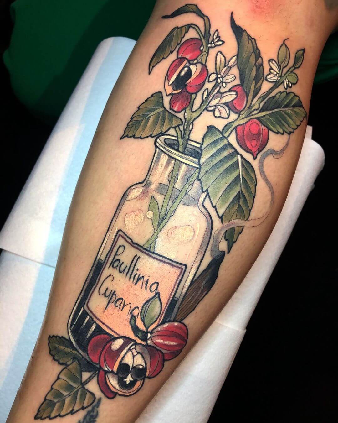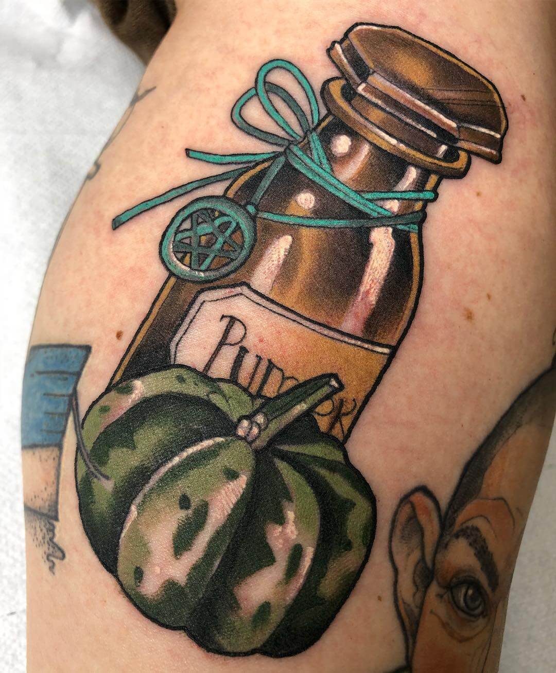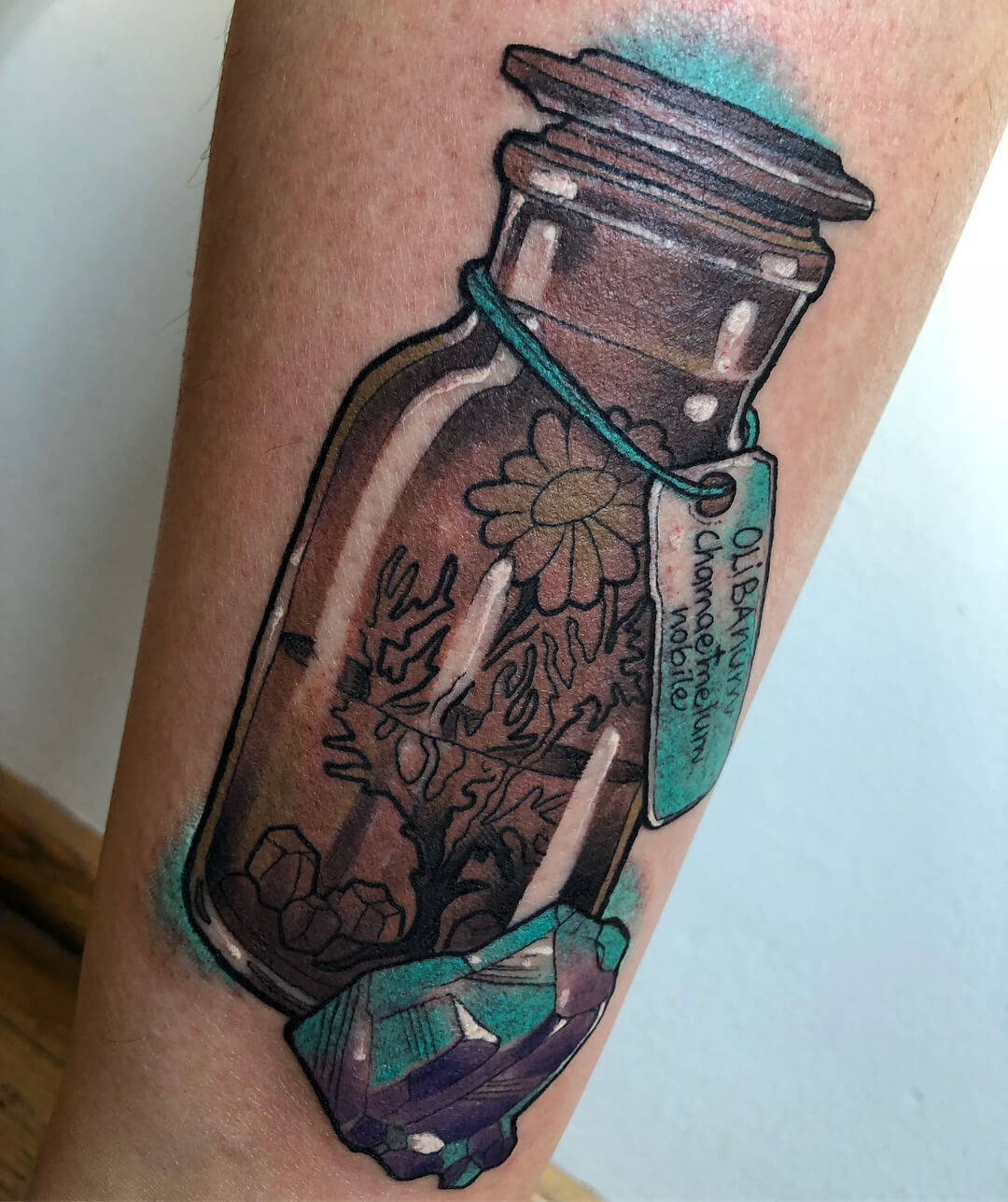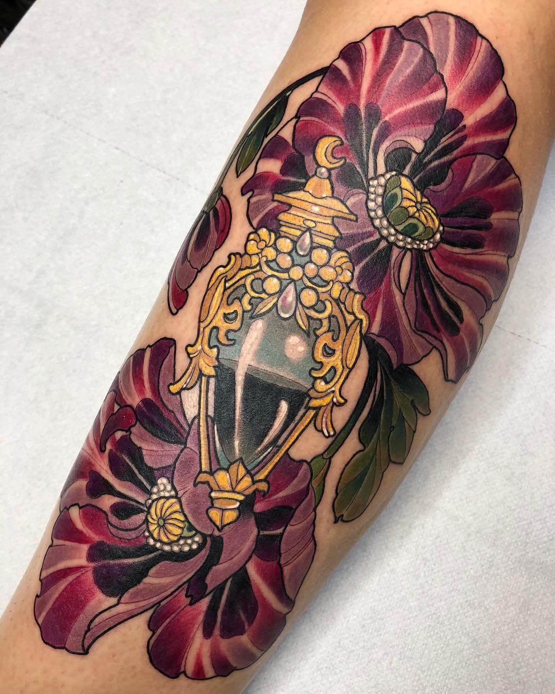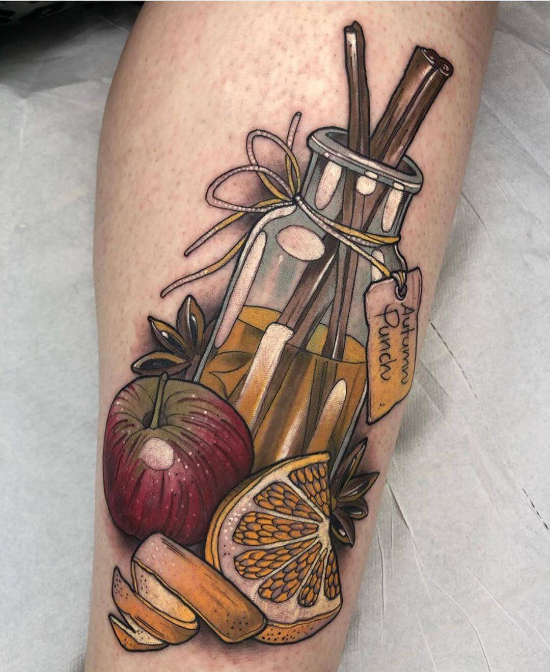 Neben Naturmotiven und Damenporträts mit surrealistischer Note sticht Lorena auch eine Menge magischer und okkulter Motive. Dazu gehören unter anderem Zaubertränke, bei denen sie die verschiedensten Zutaten kombiniert. Diese sehen nicht nur wundervoll aus, sondern haben meist auch noch eine Bedeutung oder besondere Kraft für ihre*n Träger*in. Wer sich eine Tätowierung mit Magie und Essenz wünscht, für den sind Lorenas magische Zaubertränke und Elixiere wohl genau das Richtige!